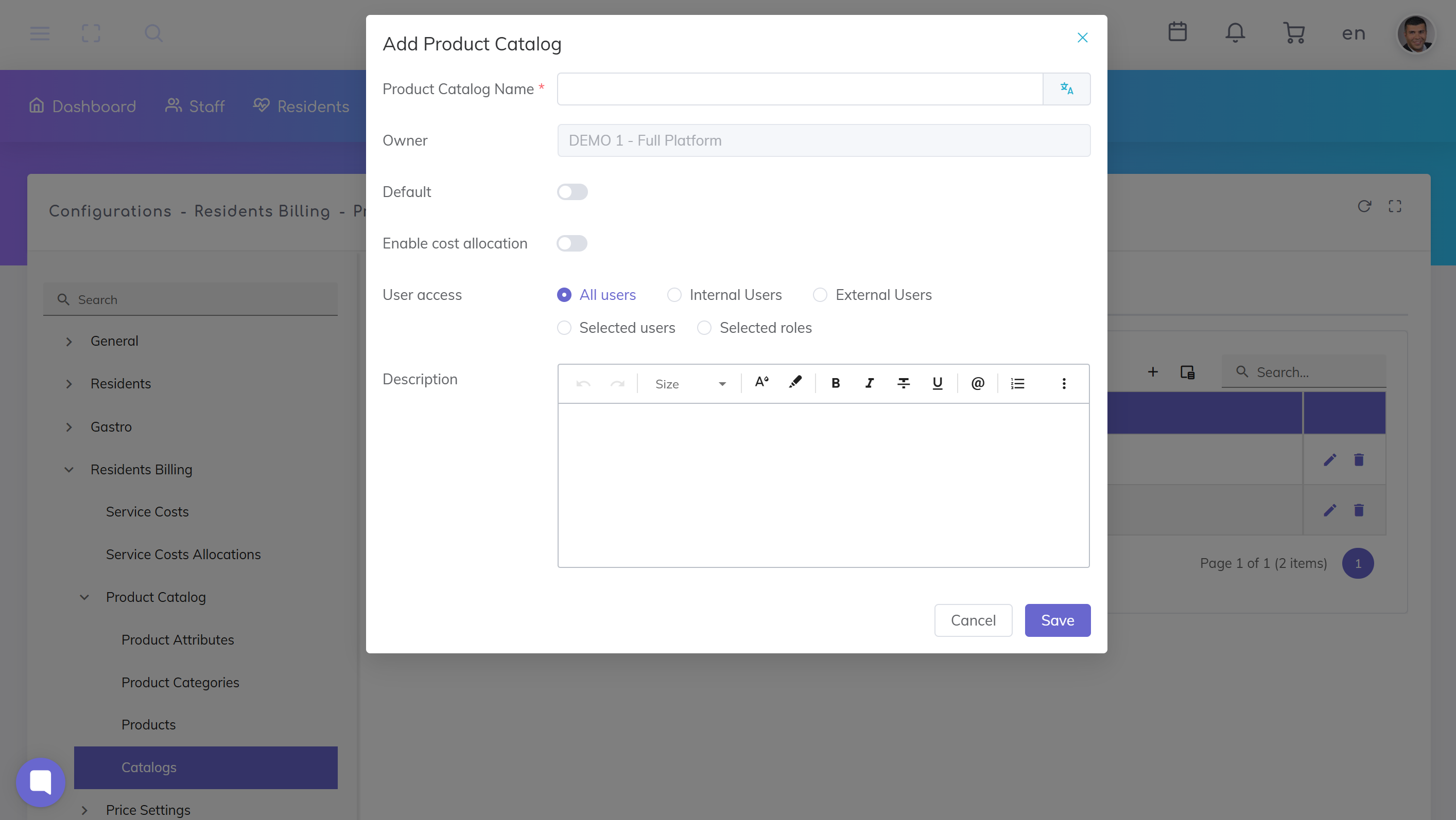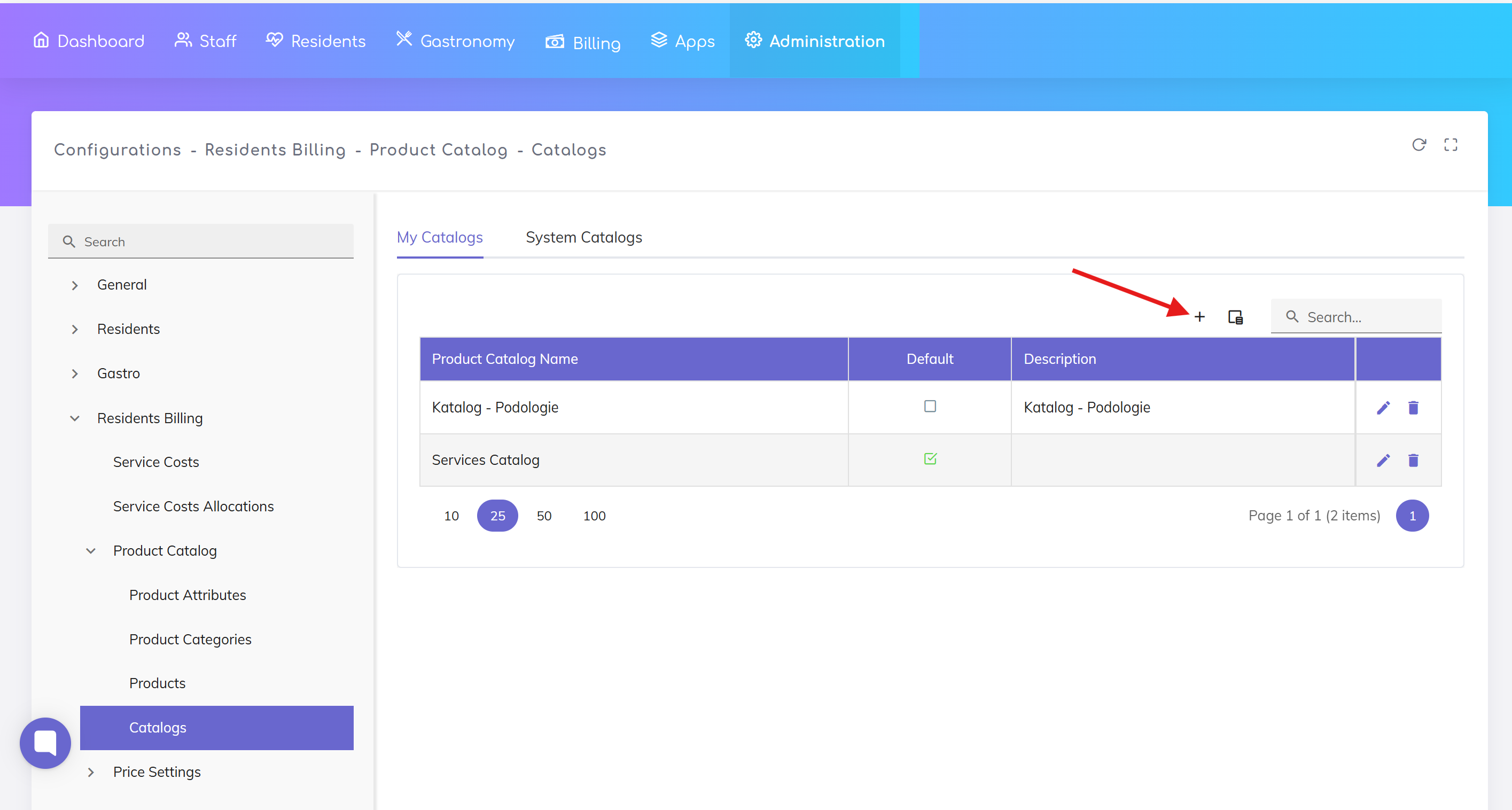 Administration → Configurations → Residents Billing → Product Catalog → Catalogs