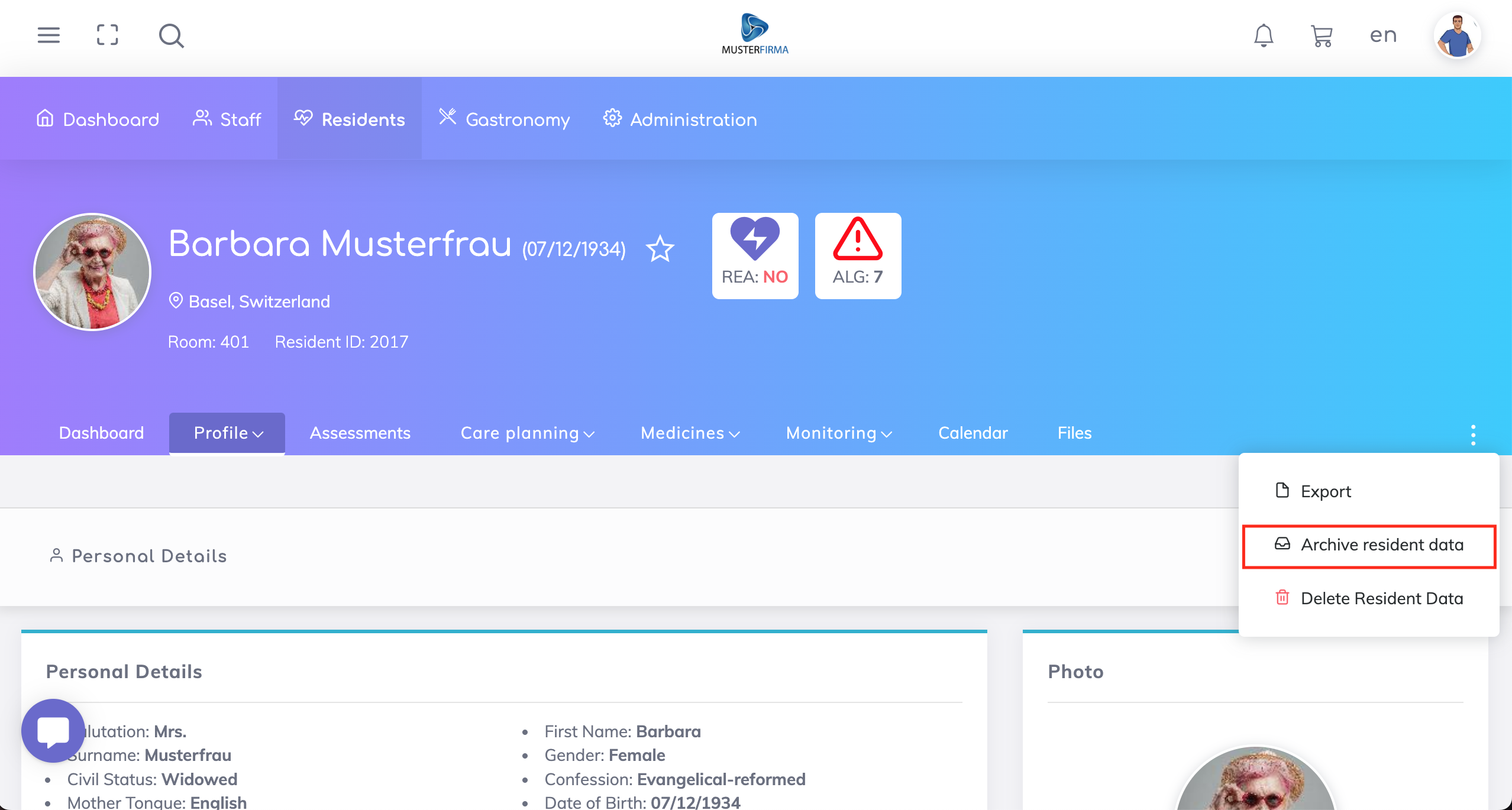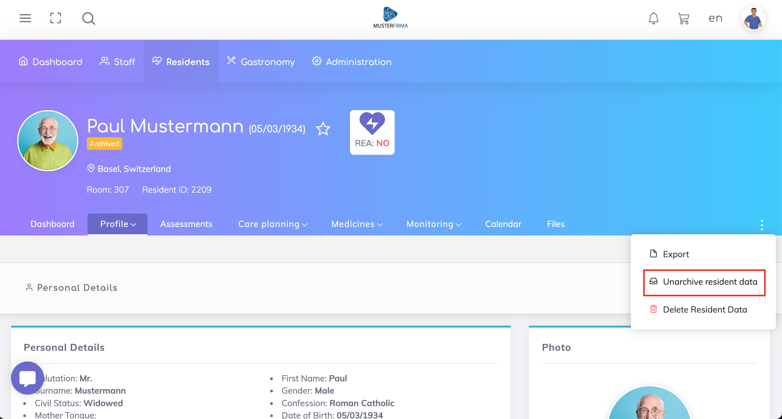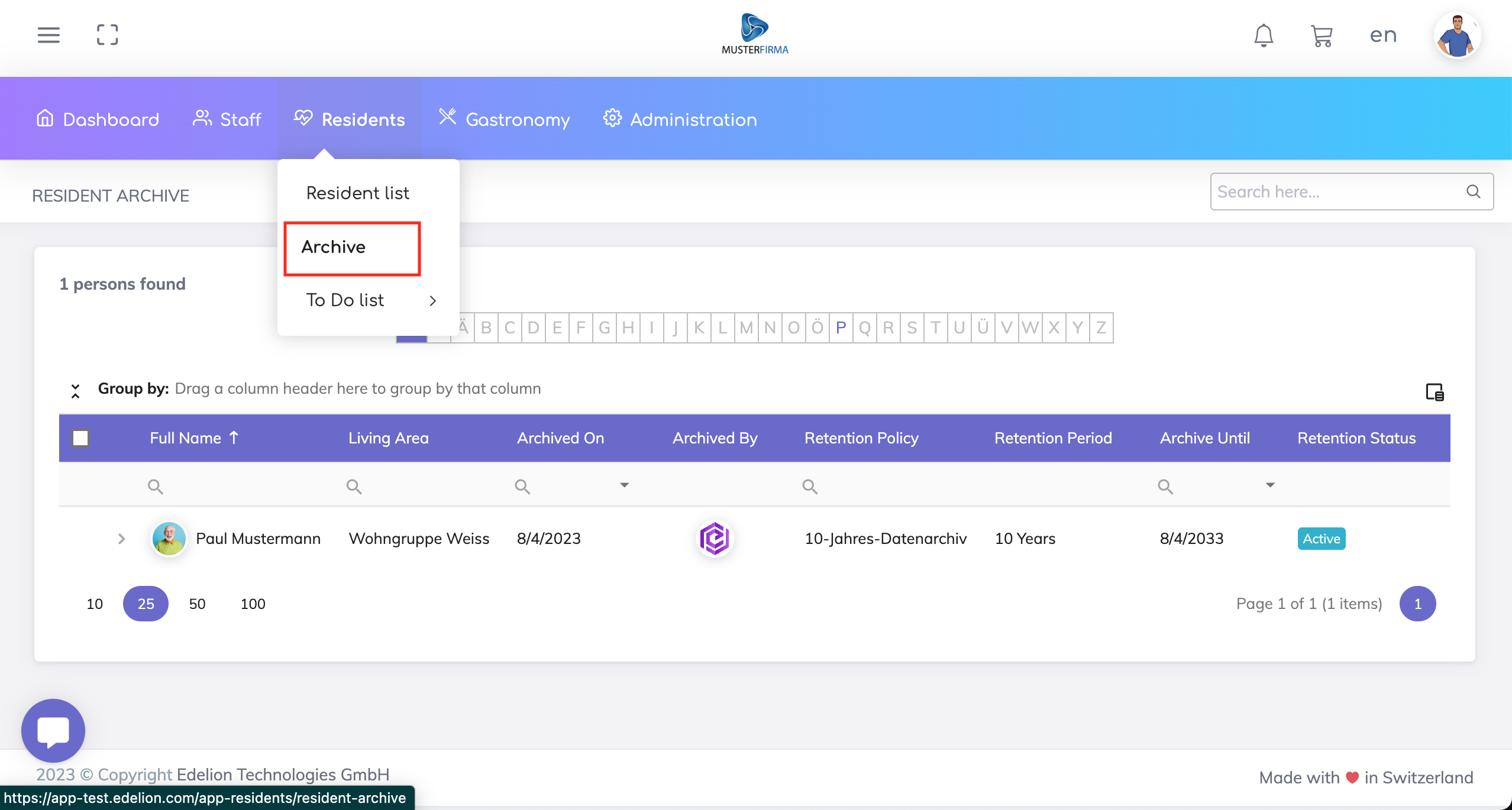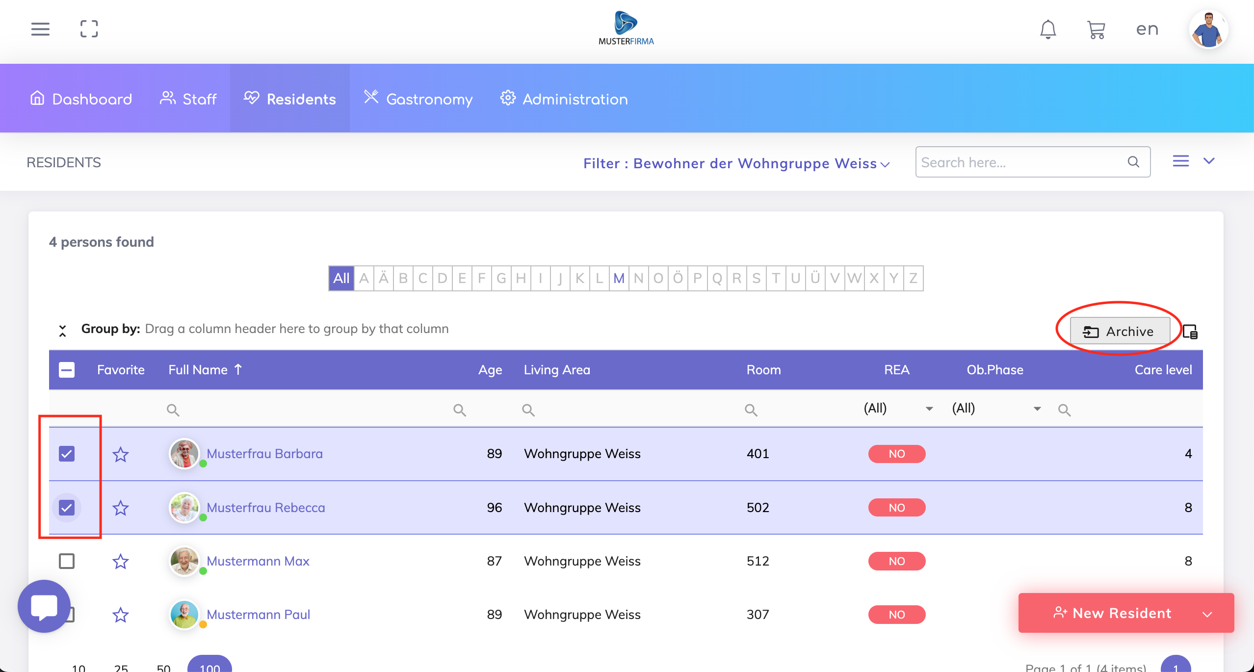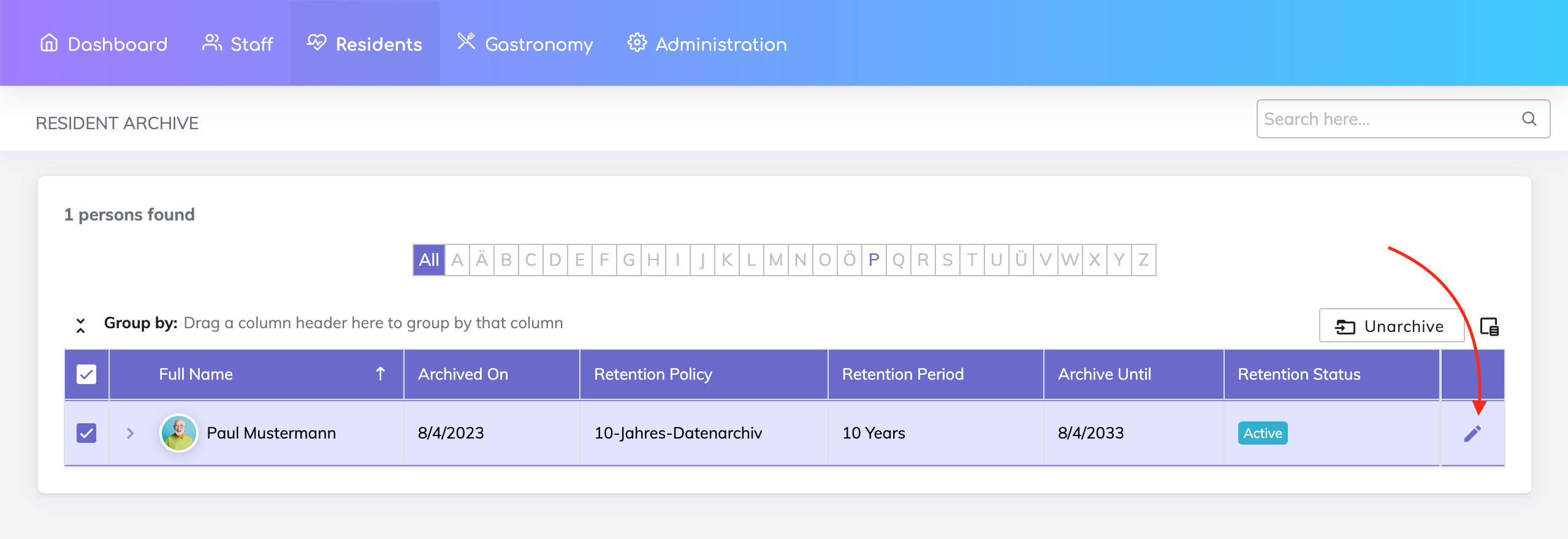 The permissions for archiving residents data is available under the Residents App, as shown below.