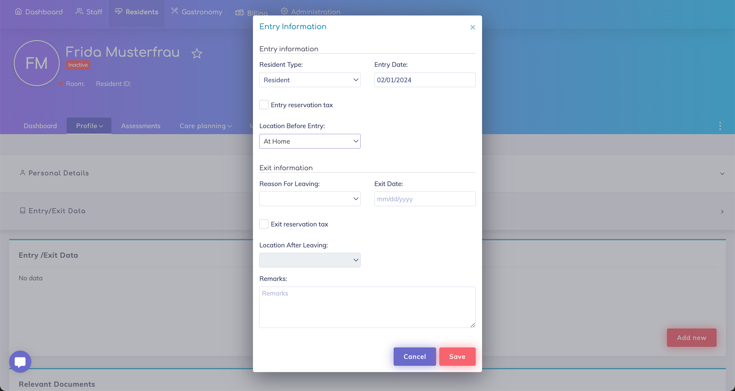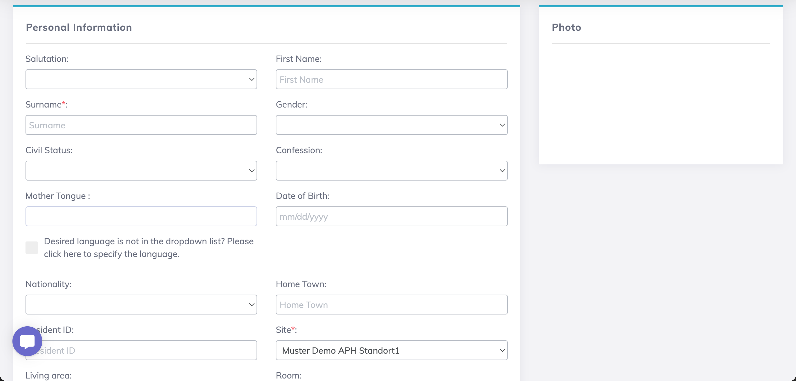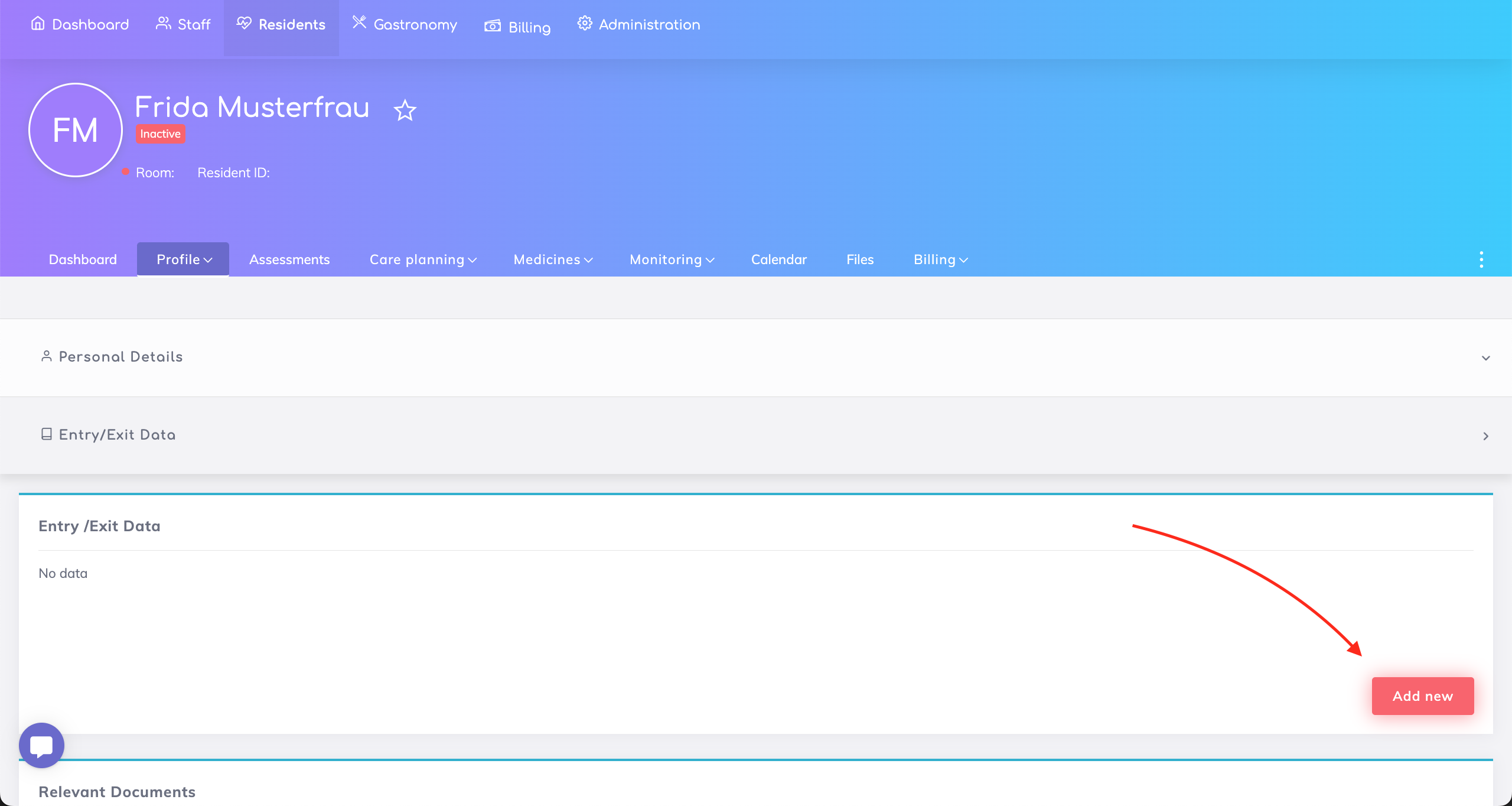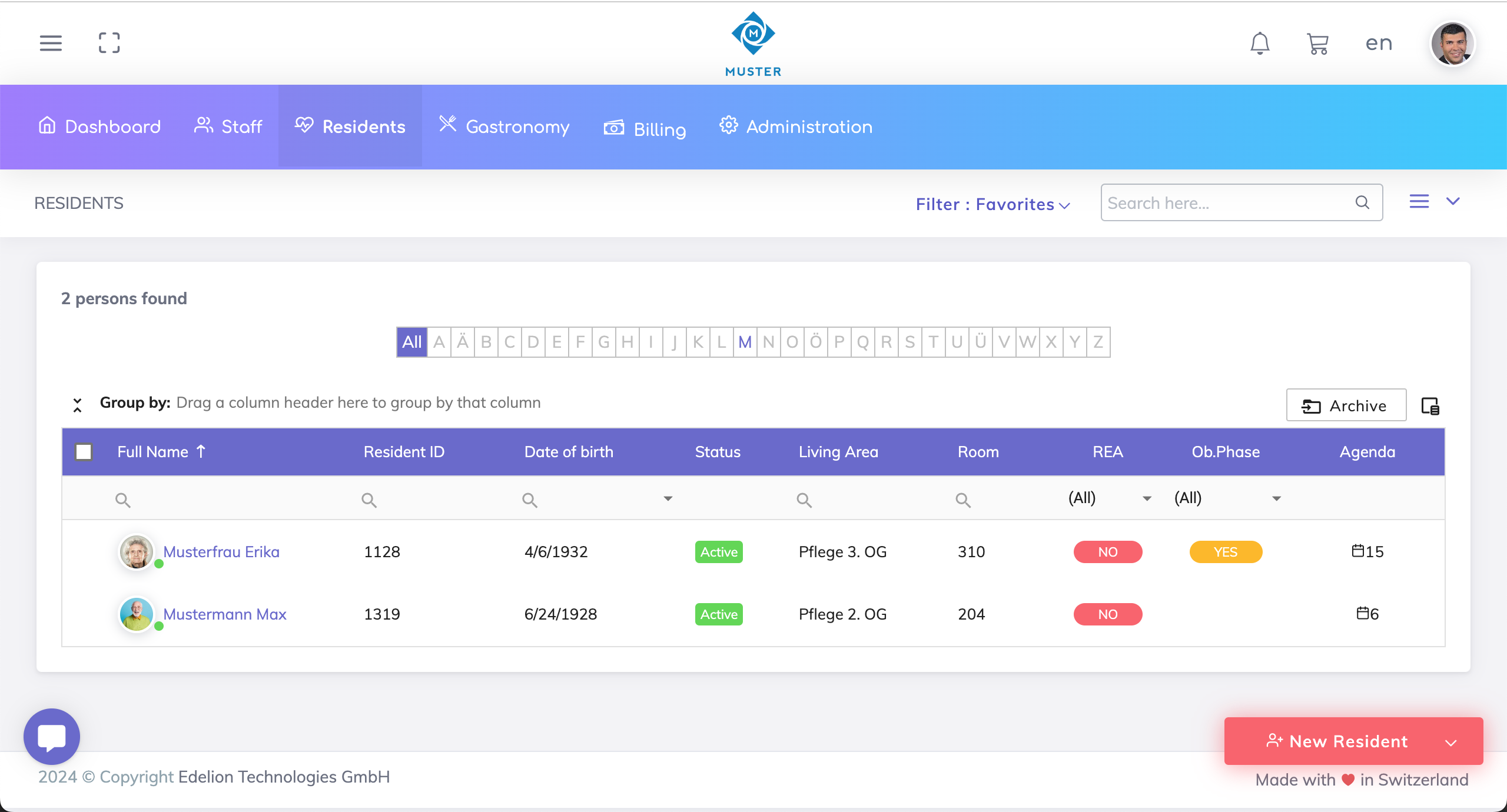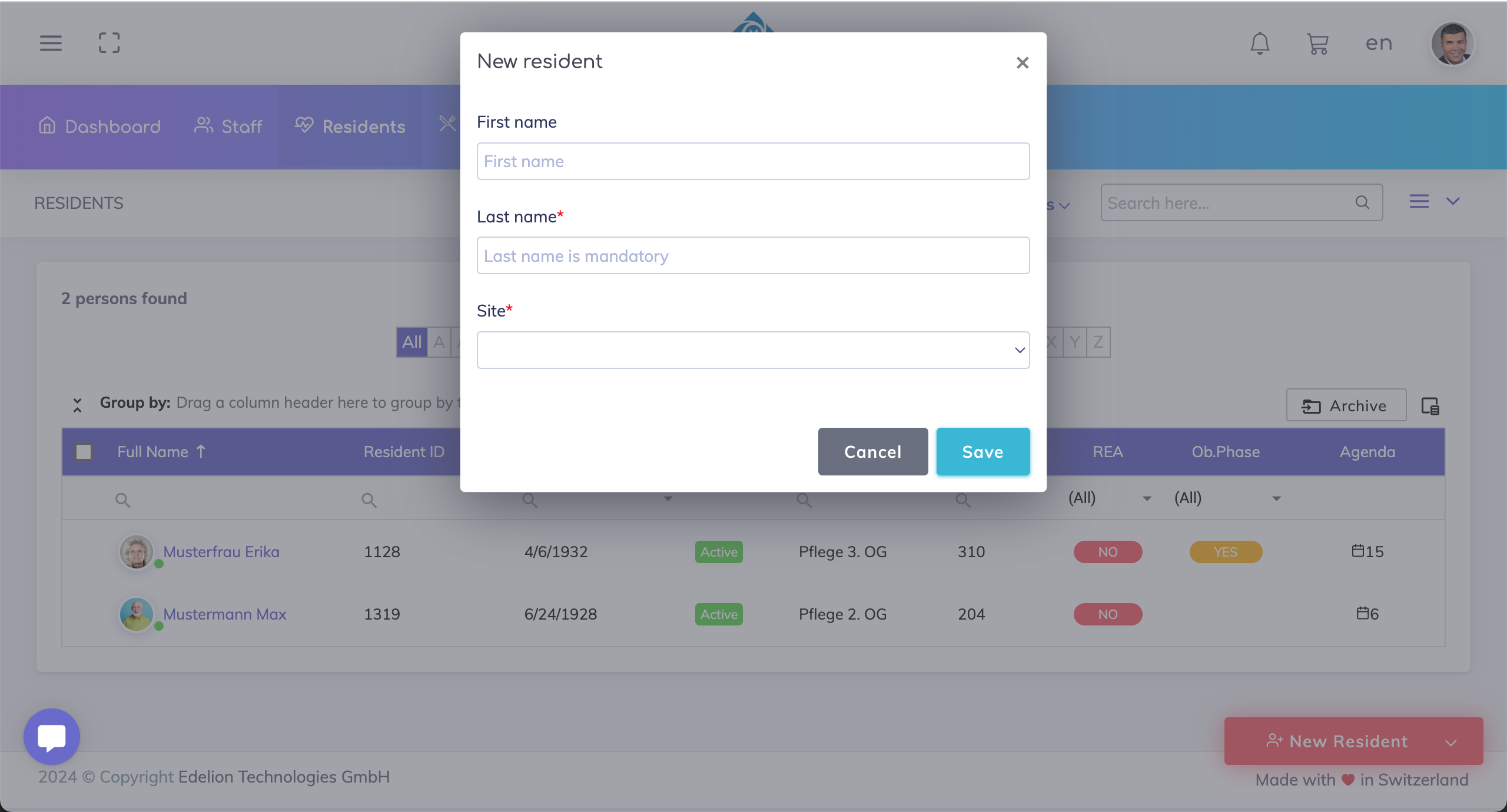 Create new resident records on the application by clicking the "New Resident" button, prominently positioned at the bottom right corner of the Resident List screen.