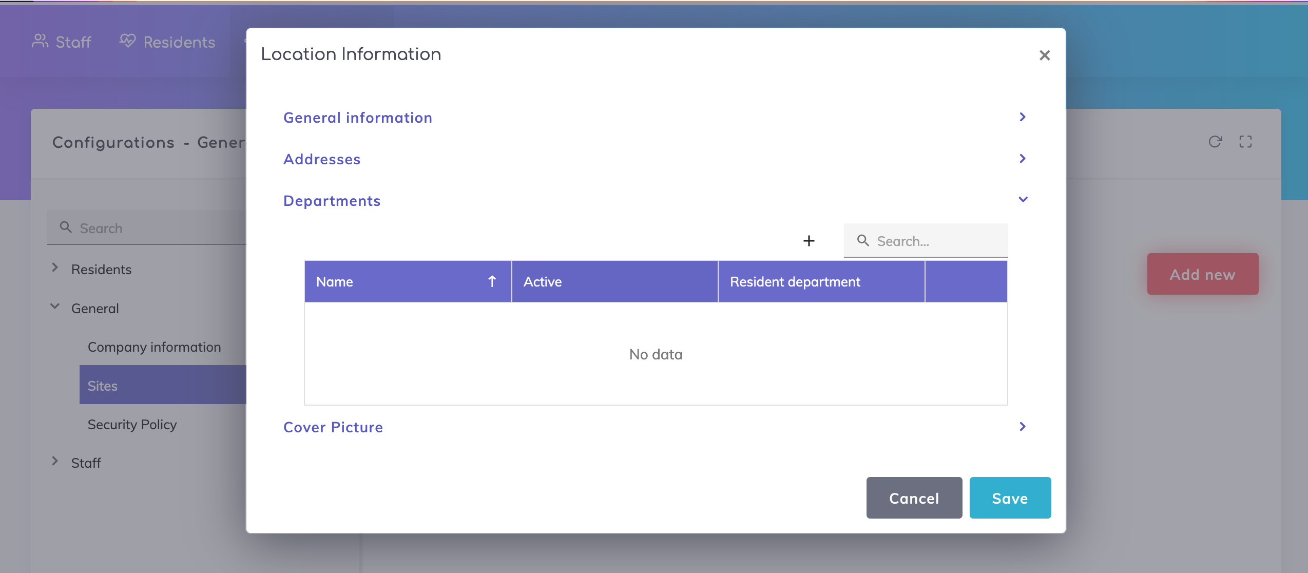 Proceed to the "Sites" section. In this section, you have the ability to create multiple care center locations affiliated with your organization. Select the "Add New" option and indicate the name of your site - all other details are optional. It is advisable to define the departments, as this information will be utilised when assigning care center residents to their respective departments.