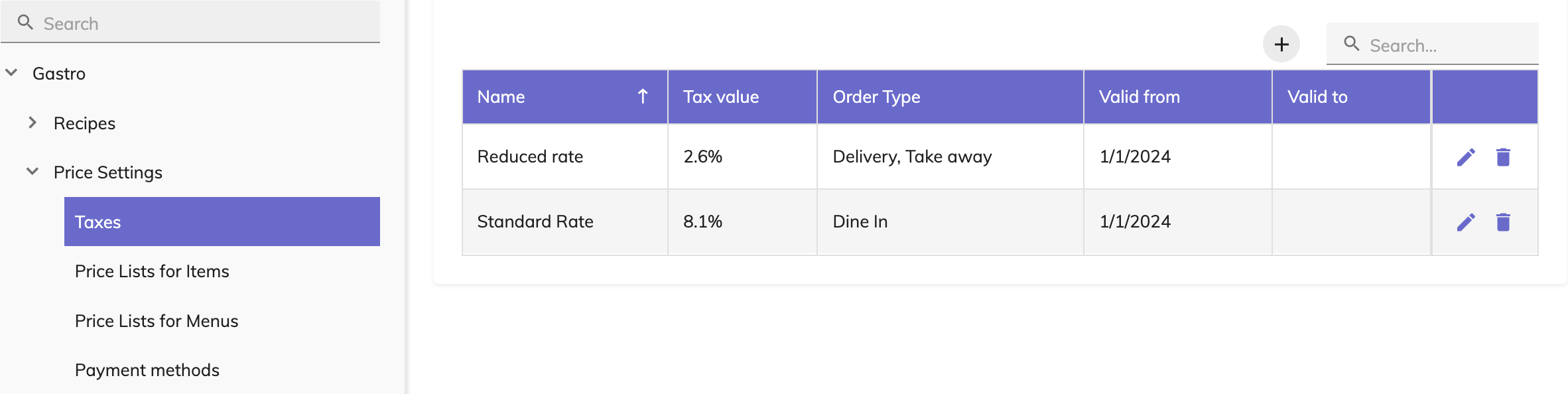 Click on + to add a new tax rate. Specify a name, the tax percentage, validity for this tax percentage and the order types for which this tax is applicable.