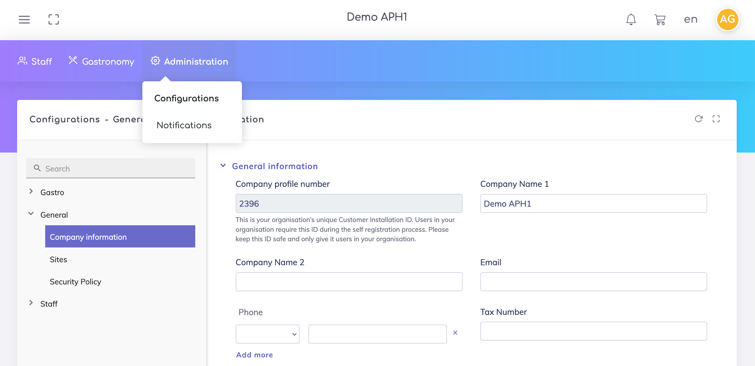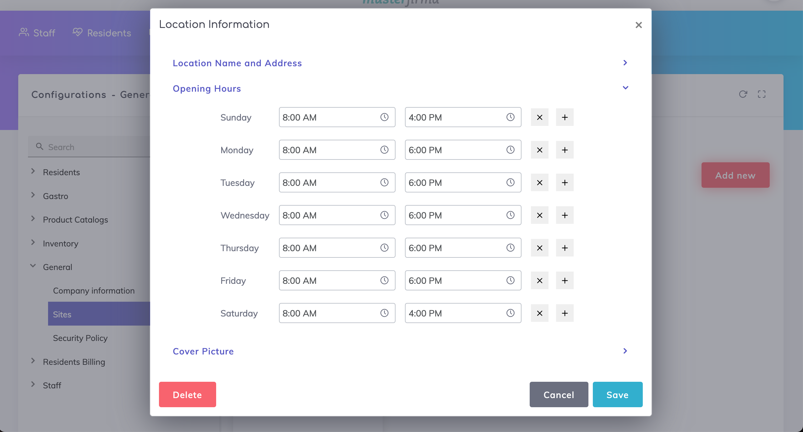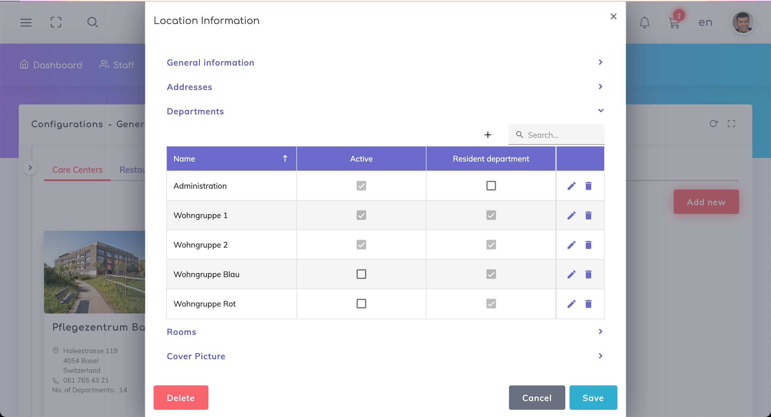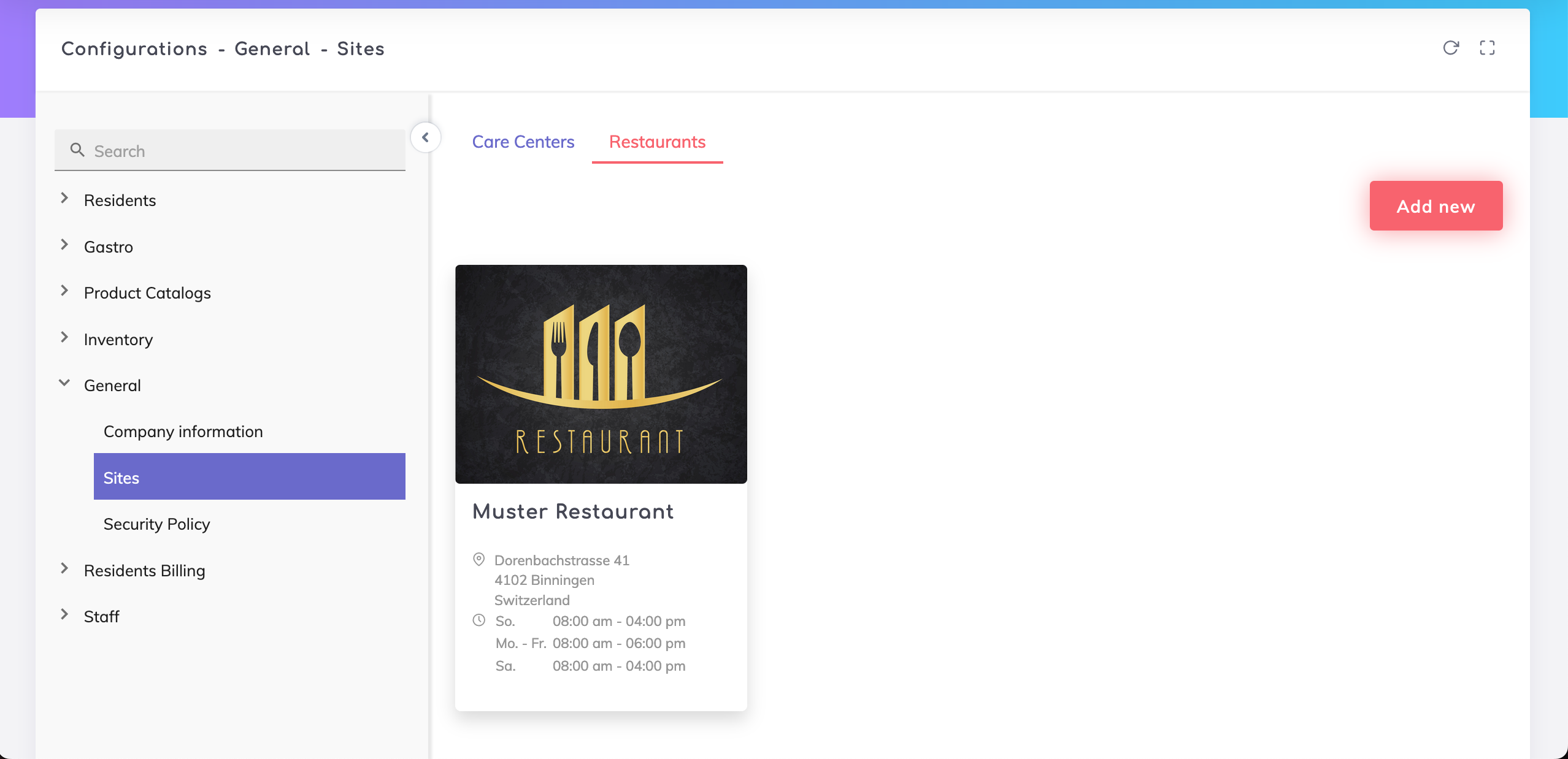 Set up your care and gastronomy departments here. You can set up one or more locations.