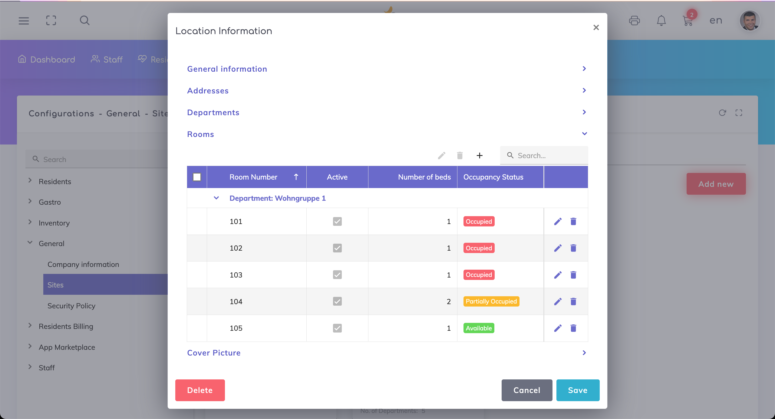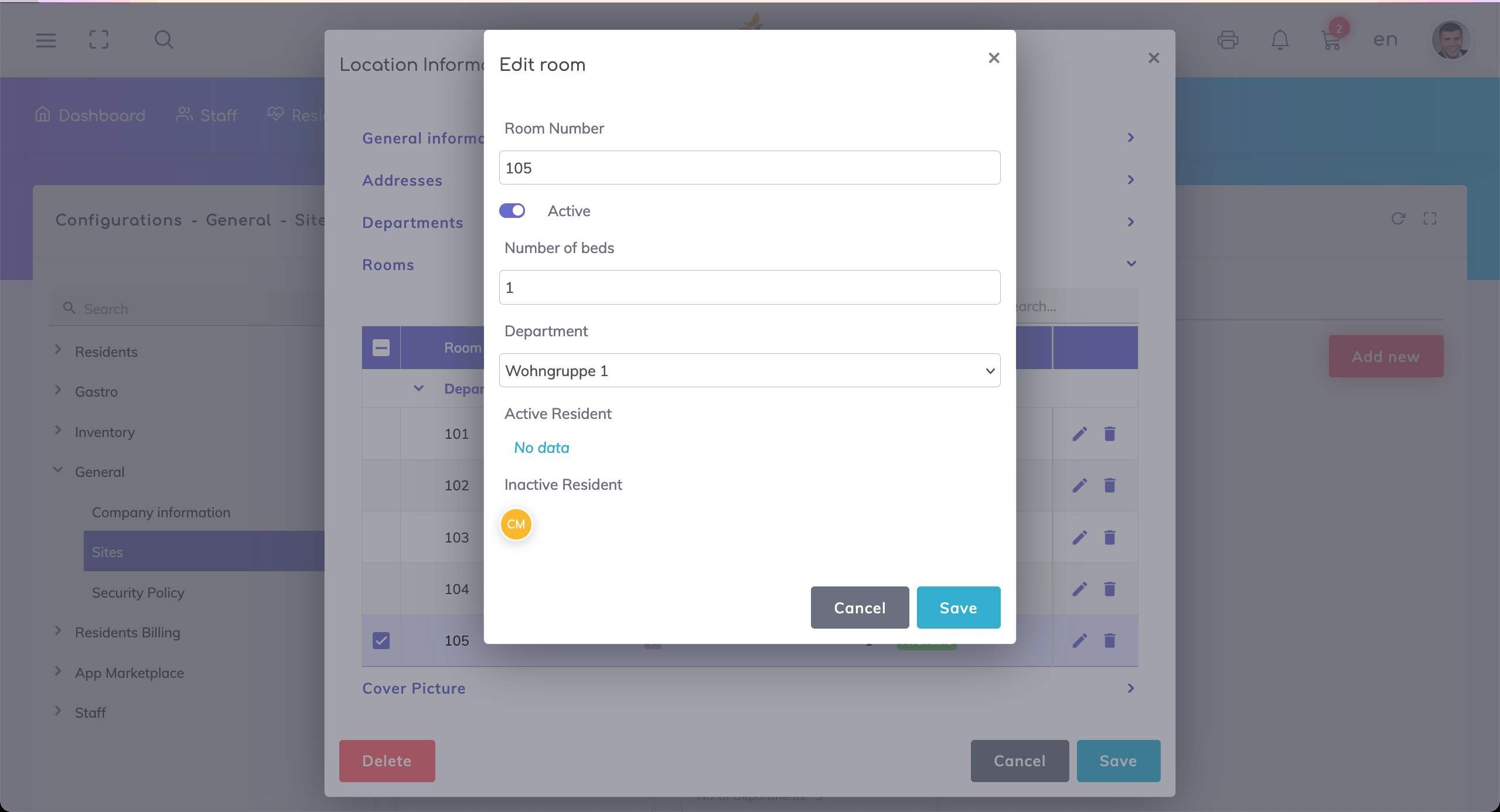 It is recommended to not delete the inactive departments as these will not appear anymore in the resident master data, especially for those residents who do not have an Active status any more.