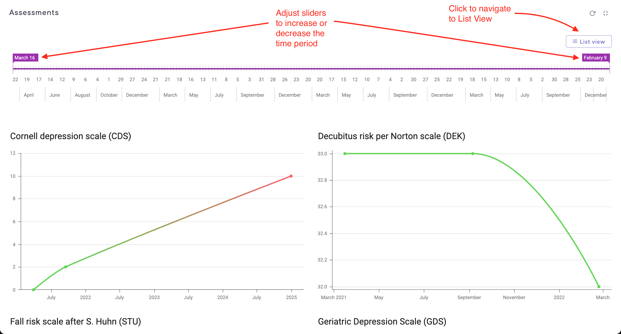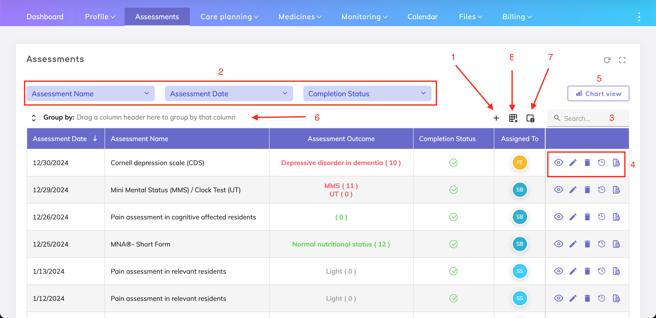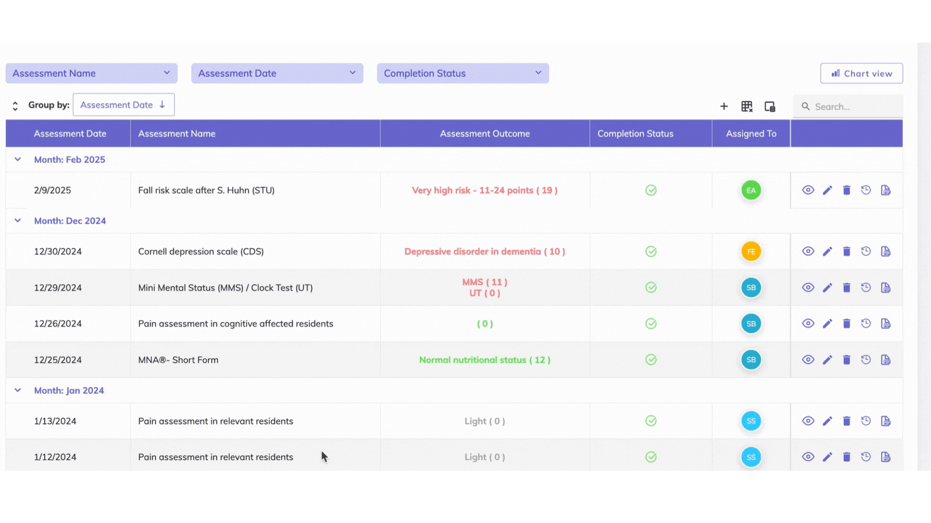 The assessments overview shows all the assessments carried out for a resident. The default view is a Table/List View as shown below and it is possible to view all the assessments in a Chart View as well.