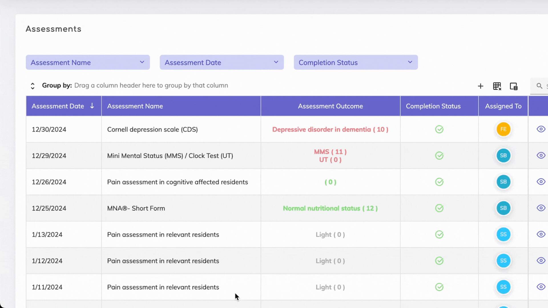 Filter fields - You can filter the data in the overview table using the assessment name, assessment date and/or completion status.
