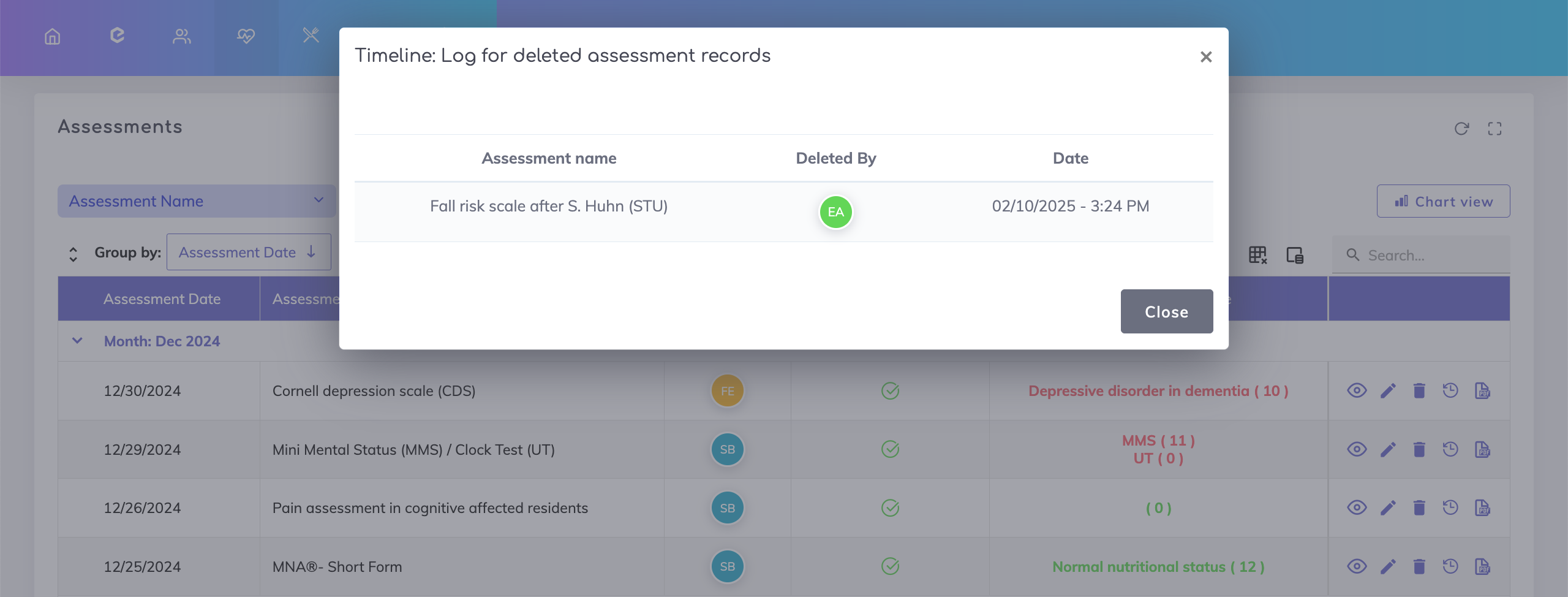 Deletion Log - Shows the assessments that were deleted by a user including the deletion date and time.