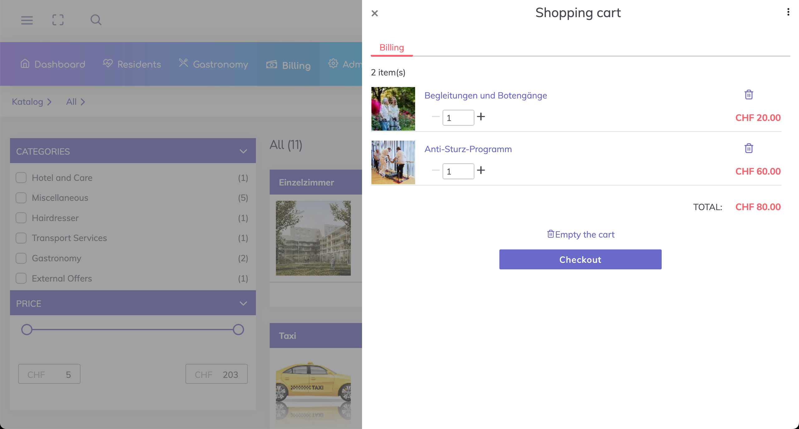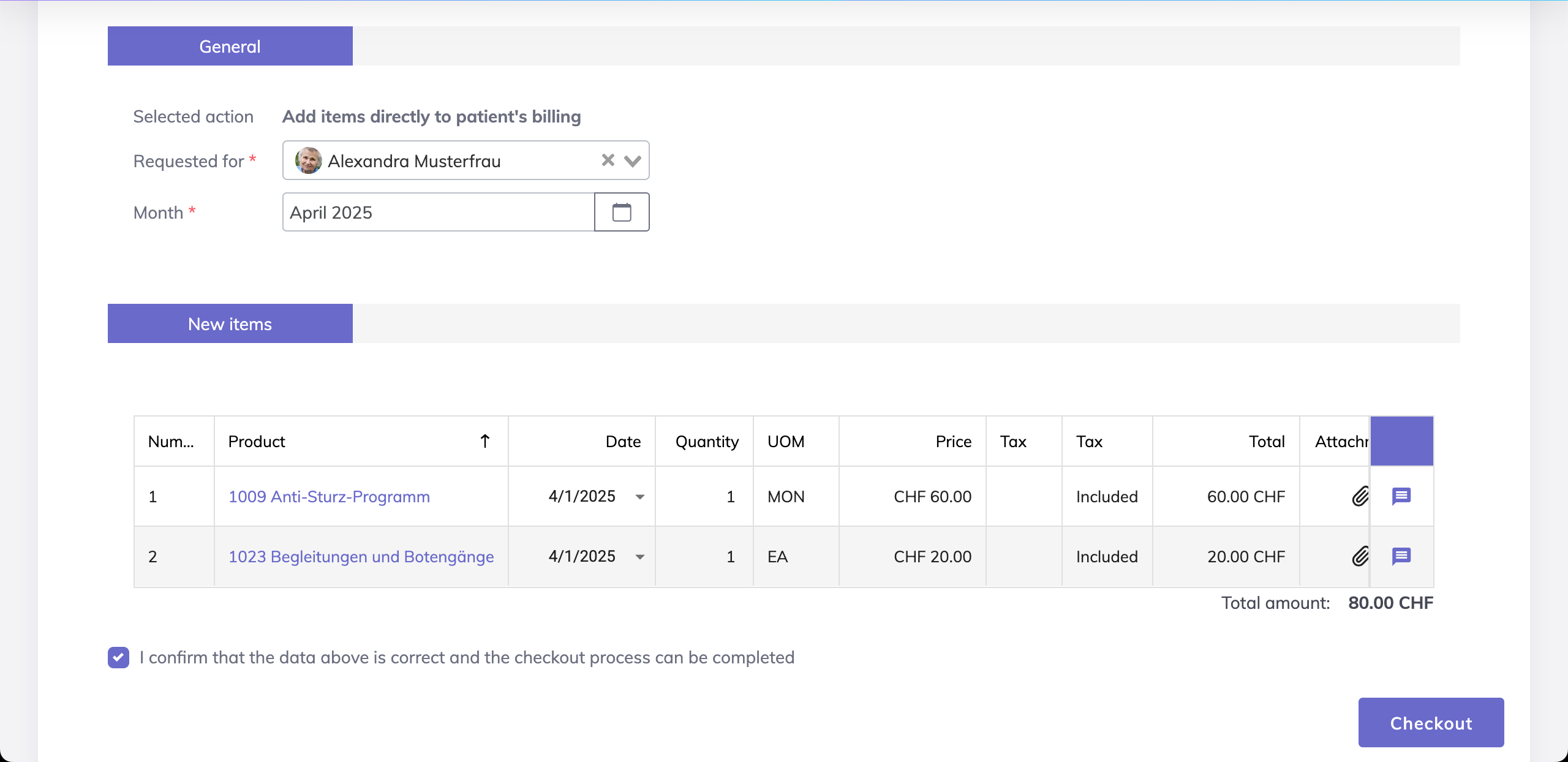 On the Checkout screen, choose the resident who received the product or service and the billing period.
