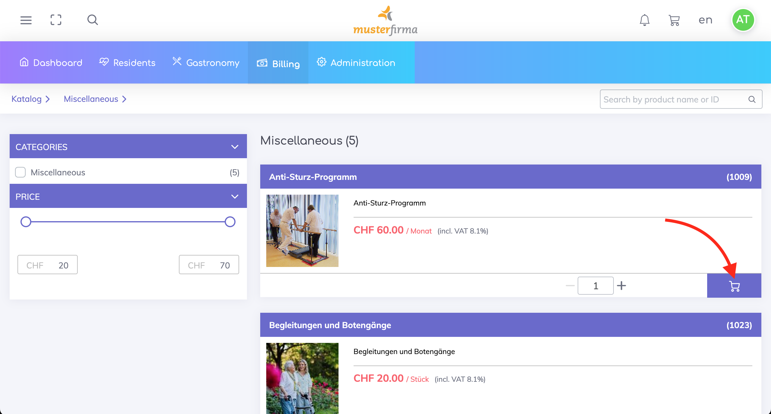 Navigate to the relevant category, then click the Add to Cart symbol next to the product you want to bill.