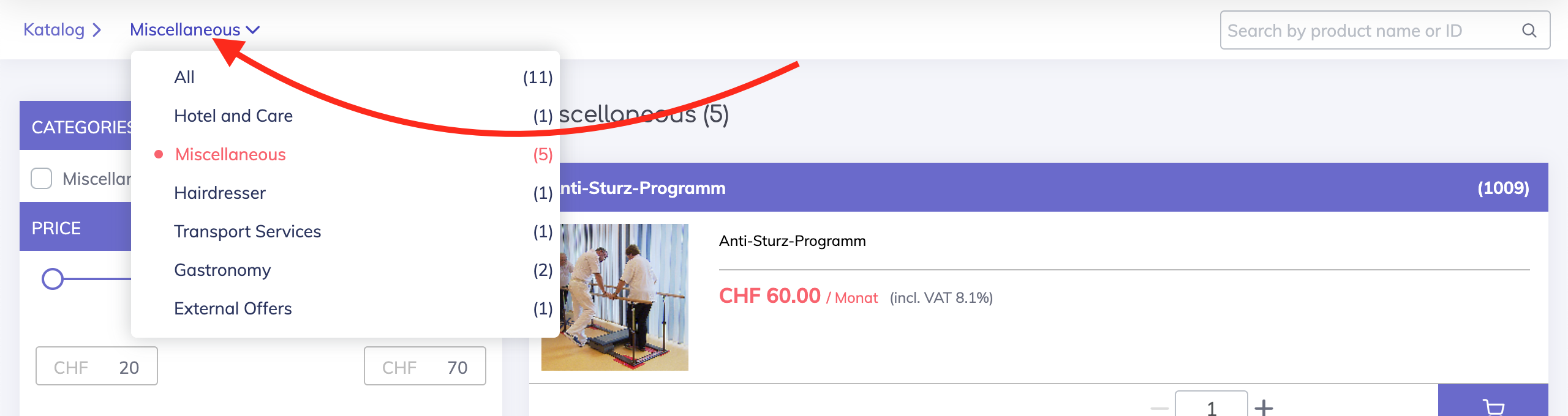 When you hover over the current category as shown, the other categories will be displayed. Click on a specific category to navigate accordingly or click on All to display all the products and services.