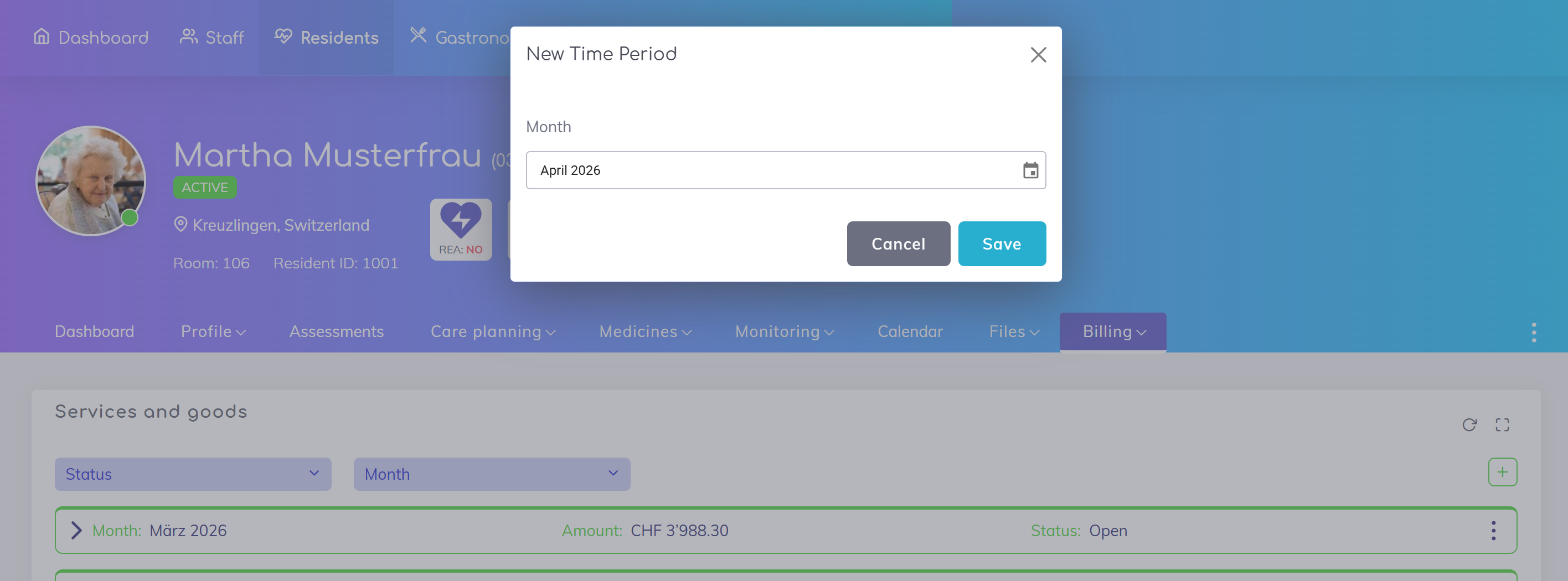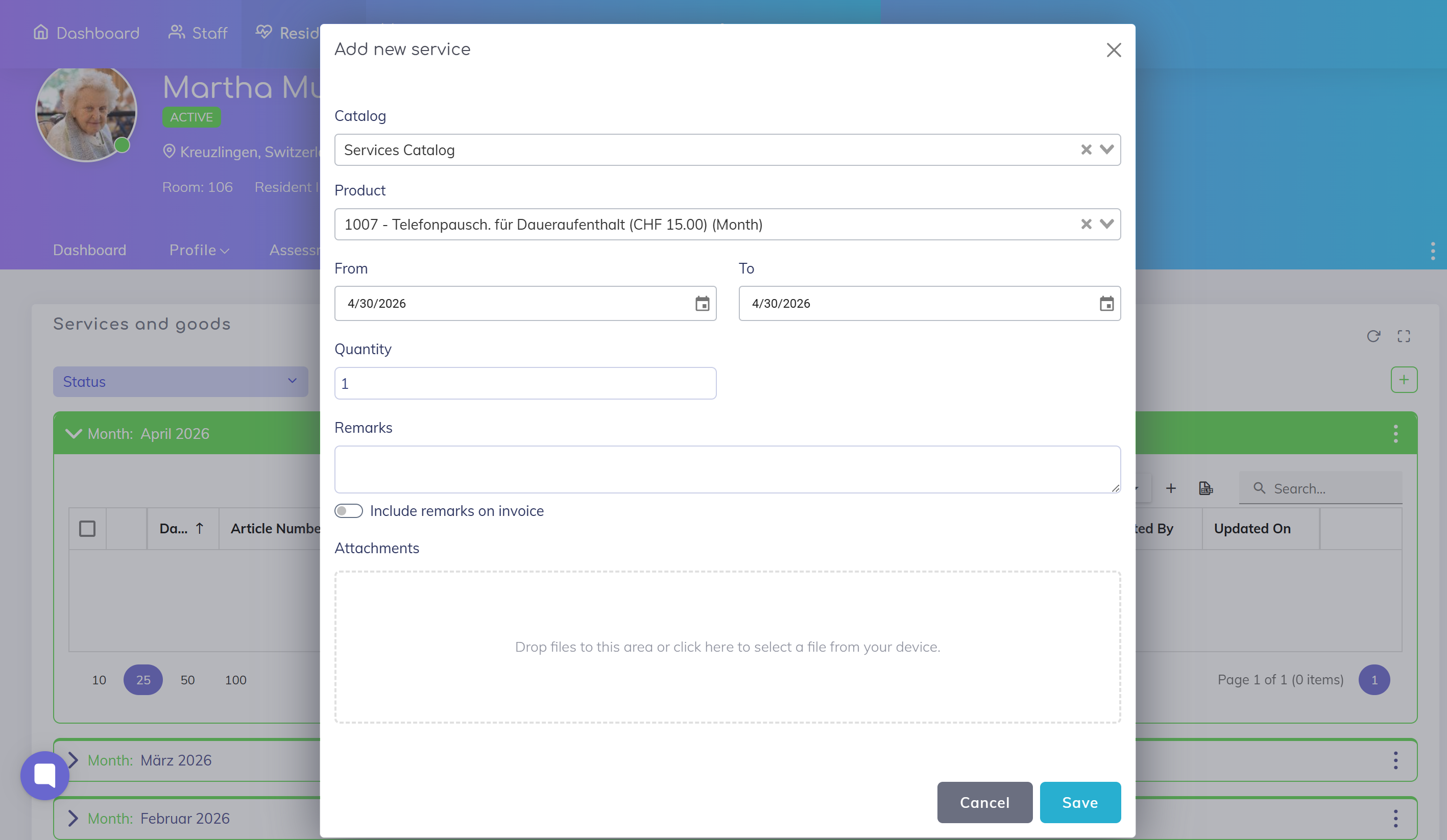 Review the details and click Save to add the service to the resident’s billing list.