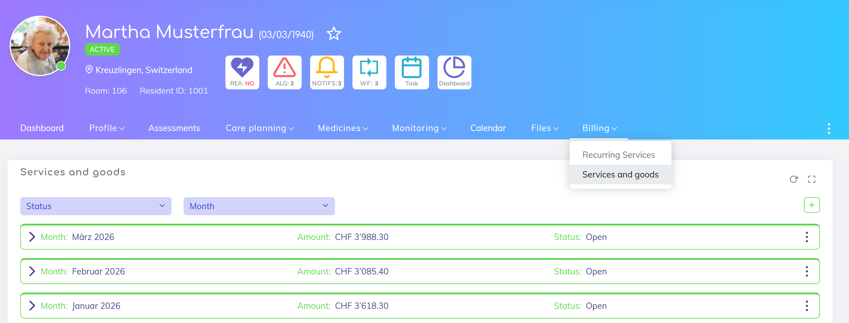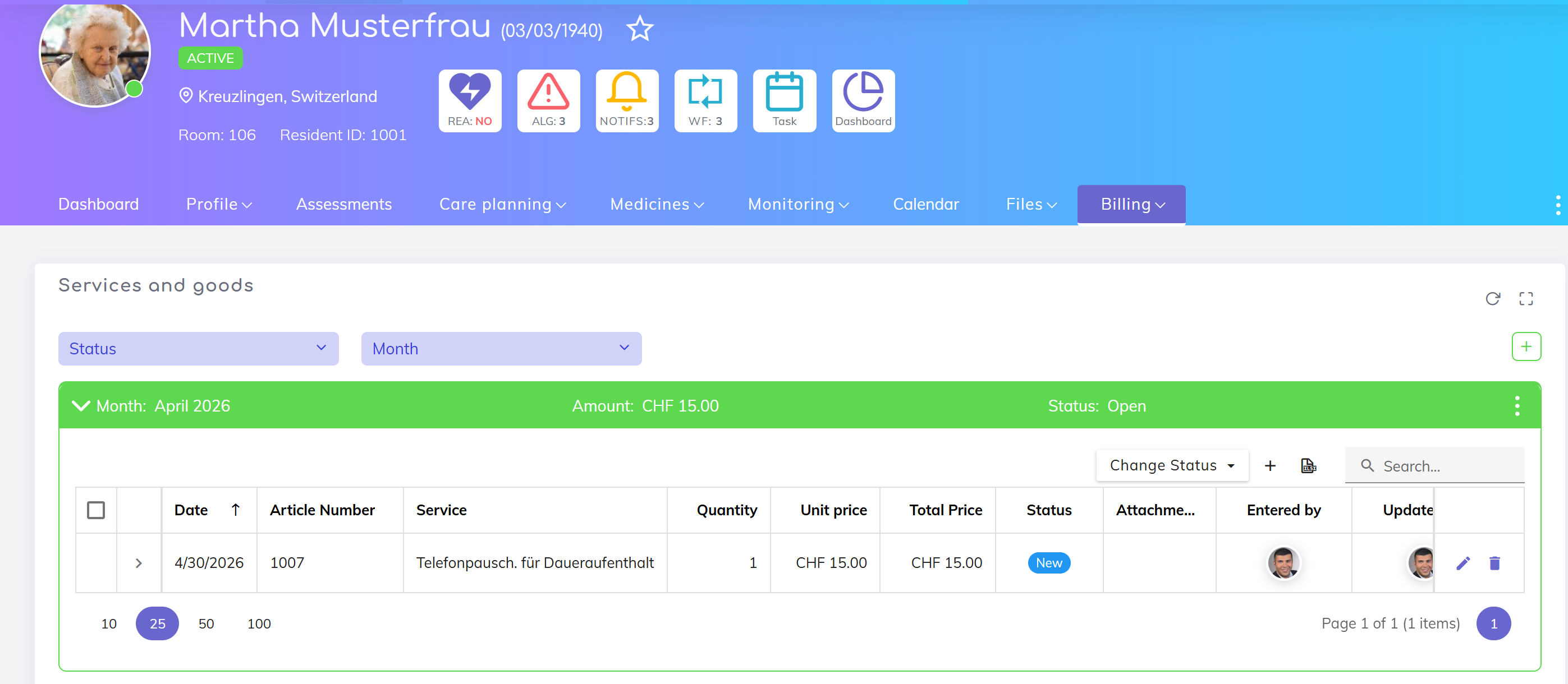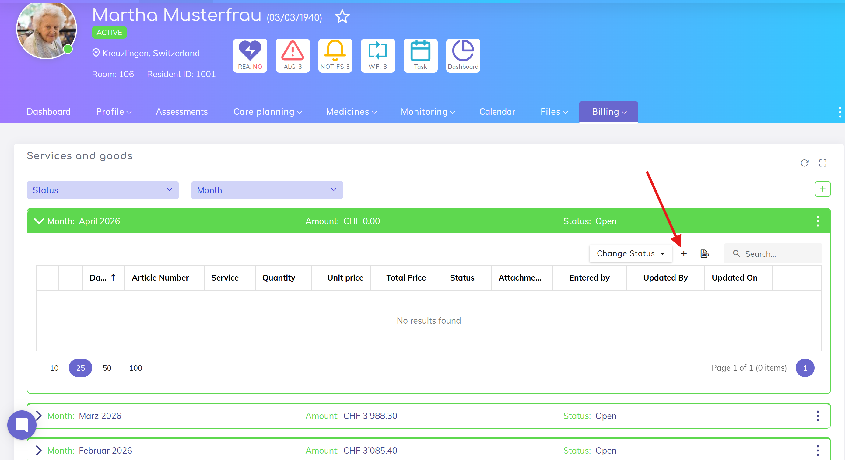 Go to the residents list and open the profile of the desired resident. Within the profile, navigate to the Billing section, Services and Goods subsection.