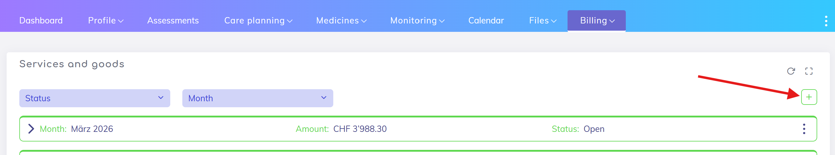 Click on the + symbol to create a new billing period. Select the relevant month on the subsequent popup and save.
