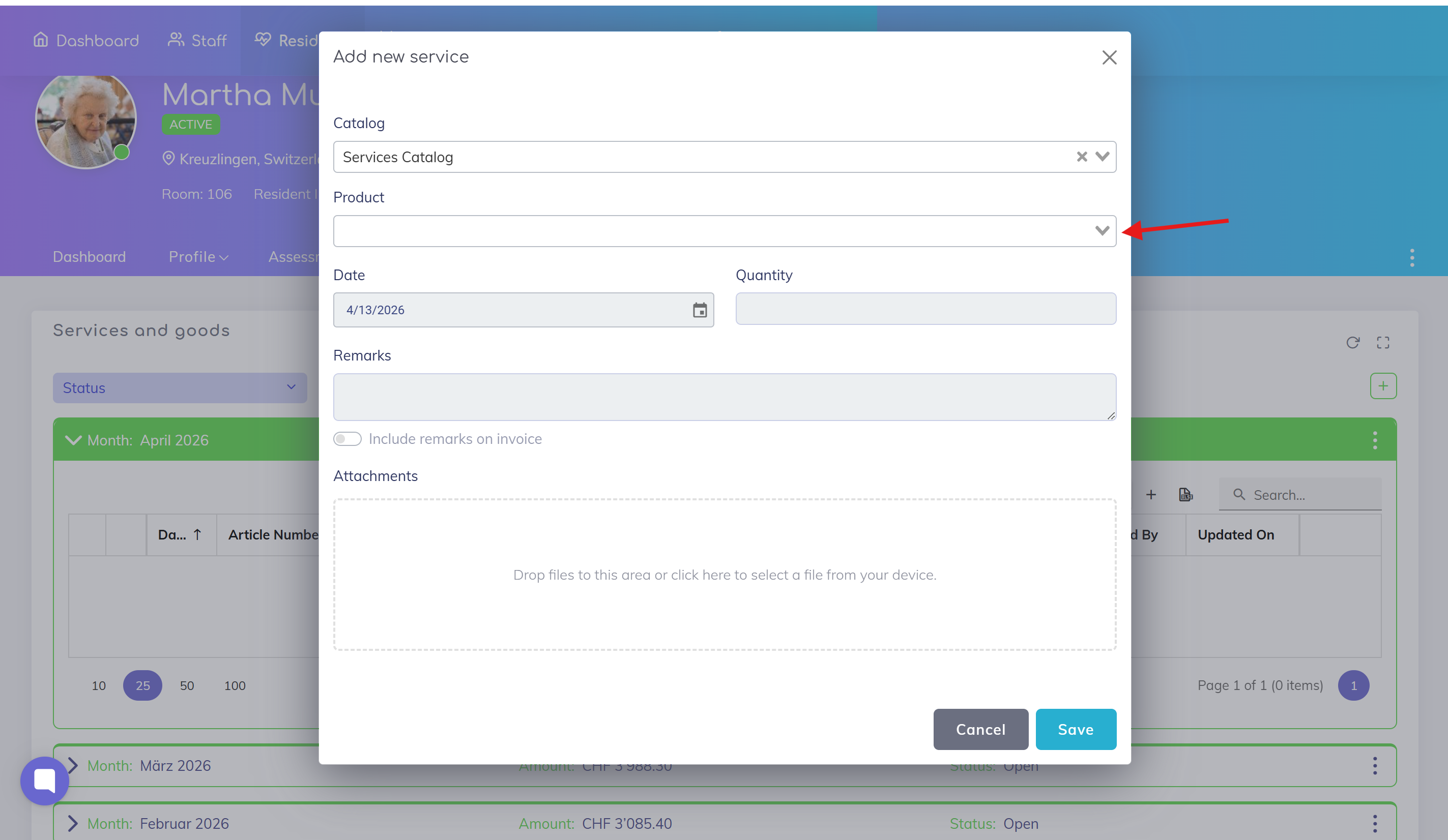 Add a product or service from the catalog to a resident’s billing items list.