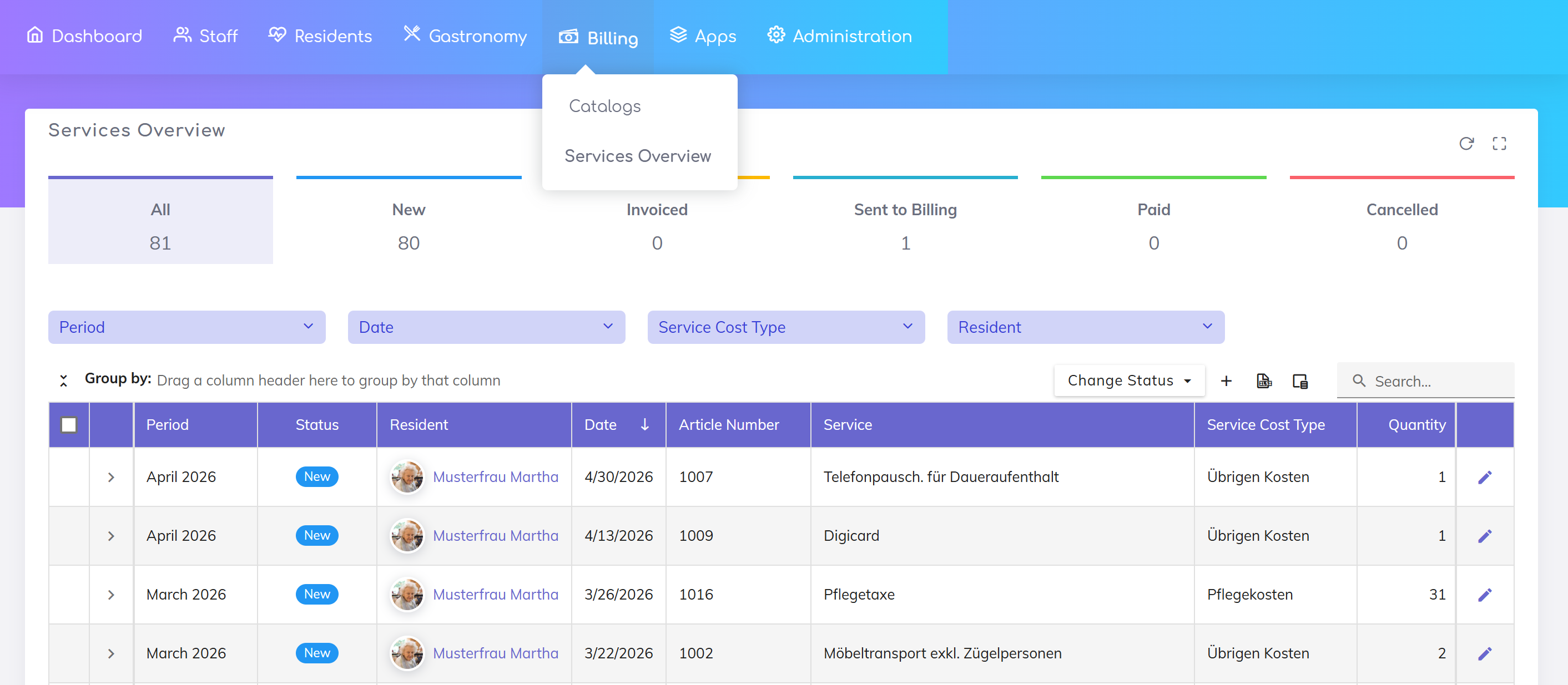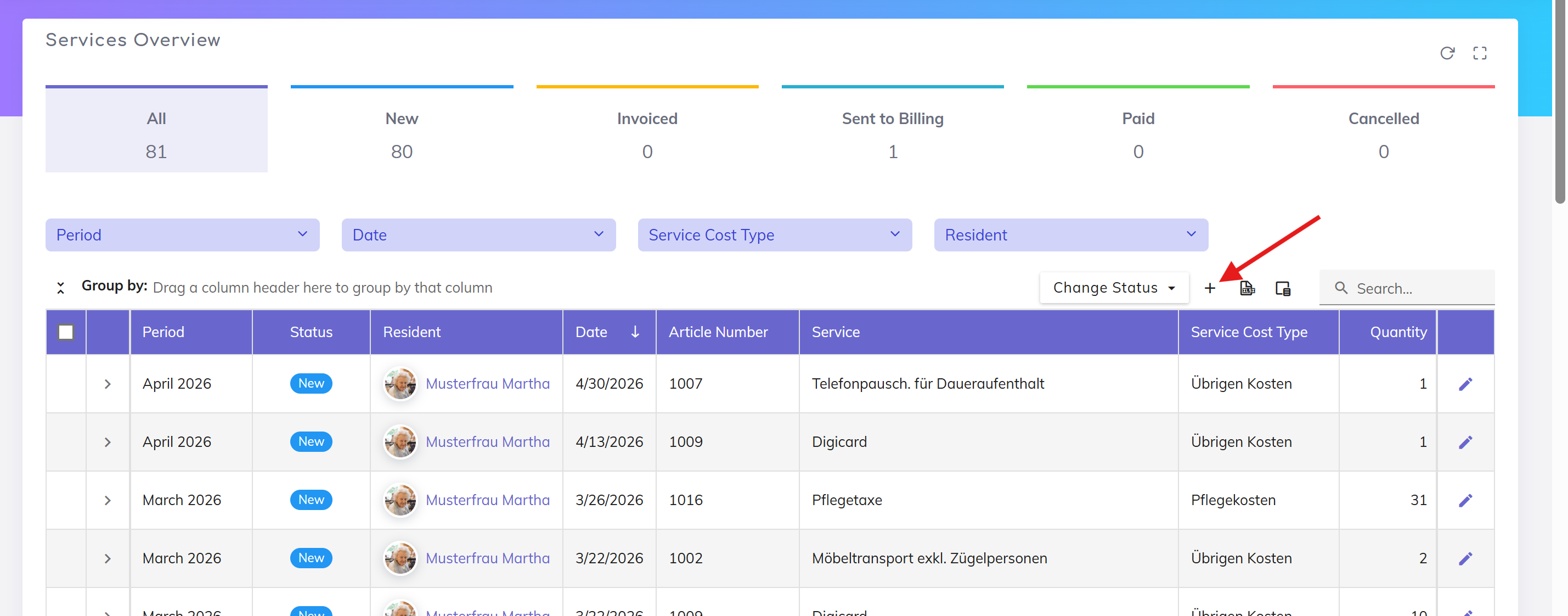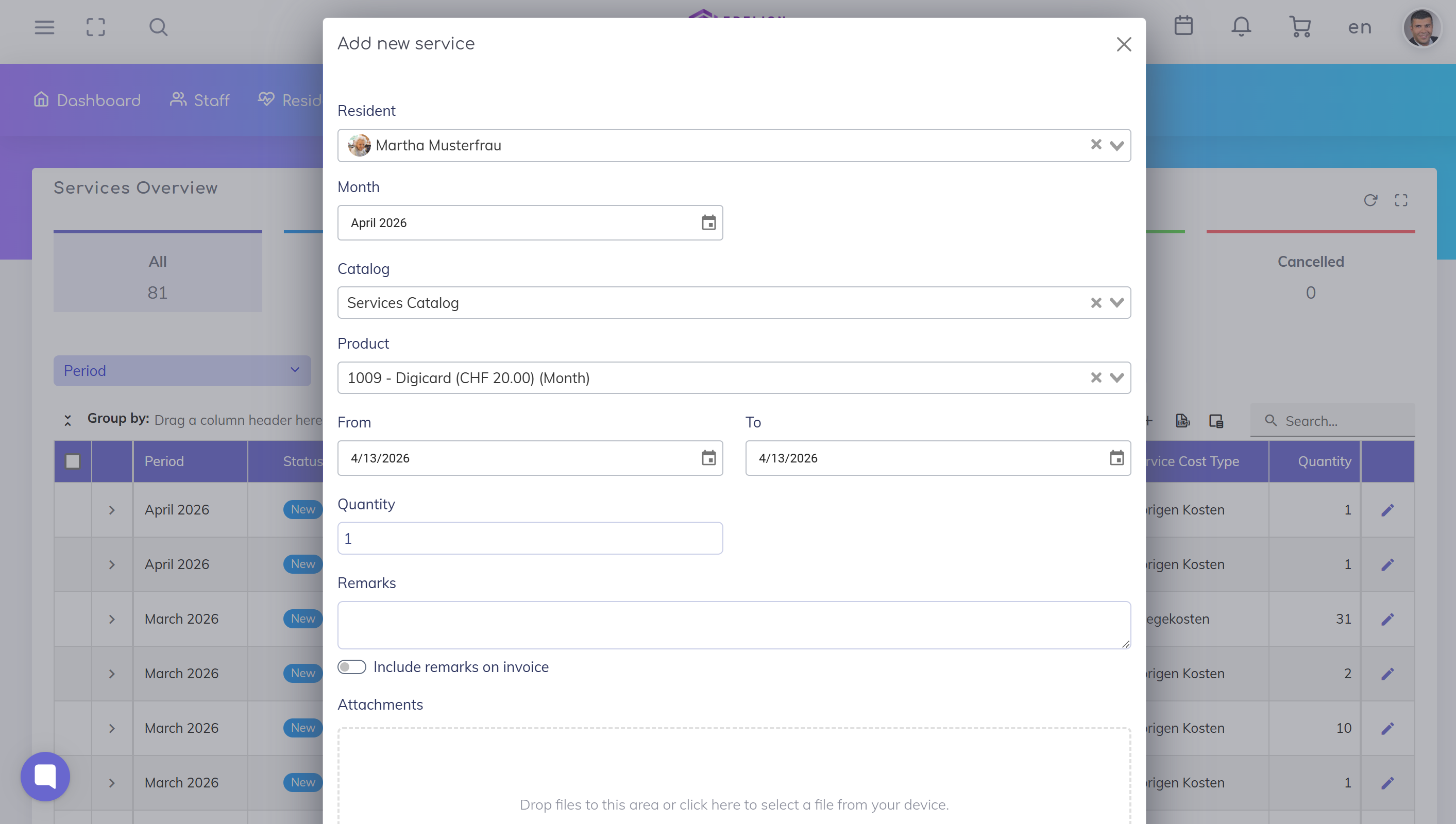Use this feature when you want to manage service entries centrally and select both the resident and the service in one place.